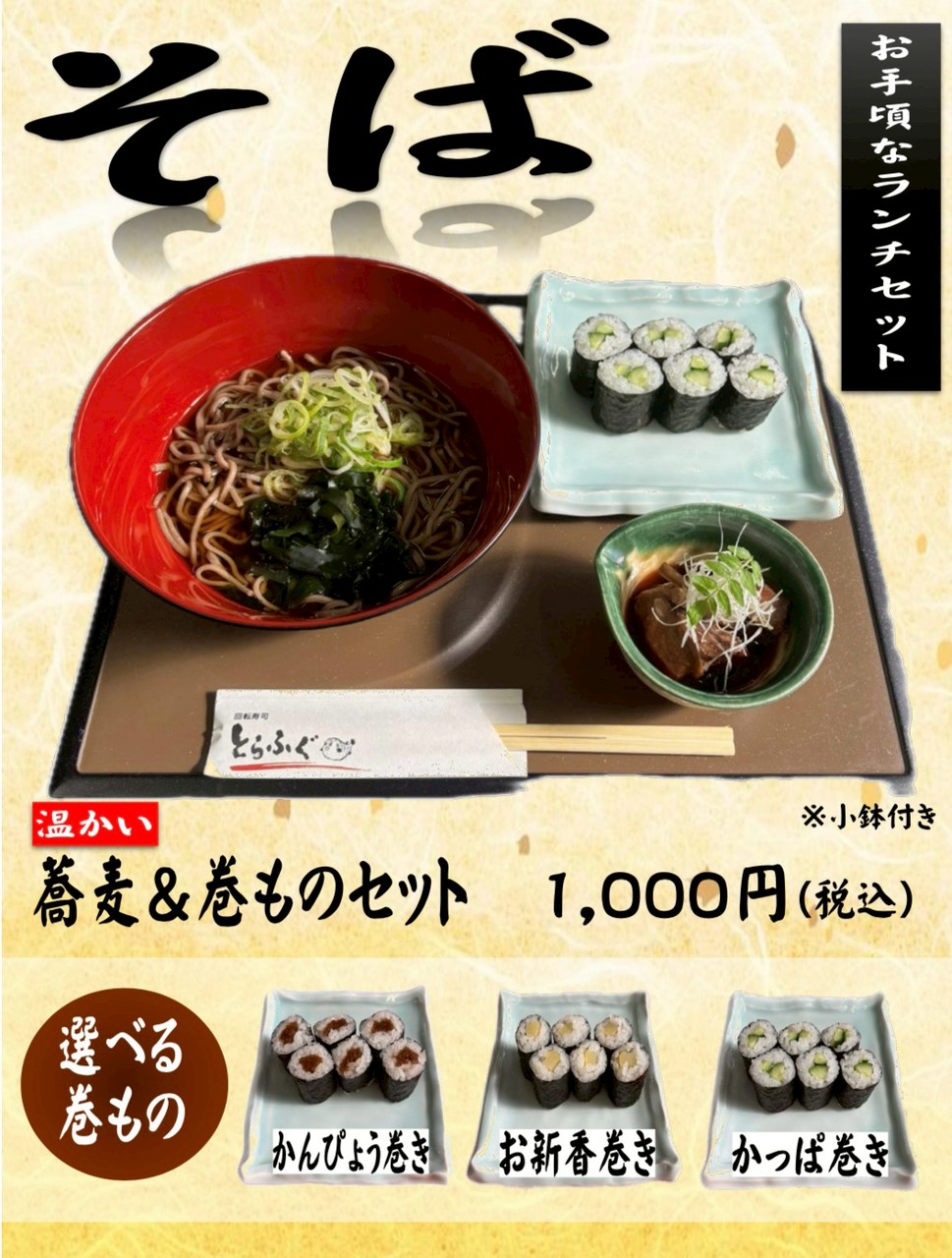 投稿日: 2026年2月5日2026年2月7日 投稿者: とらふぐWeb管理人お手頃な平日ランチメニュー:蕎麦&巻ものセット 2026年2月5日より、新しいお手頃平日ランチセット「温かい蕎麦&巻ものセット」1,000円(税込)をご提供いたしました。 巻ものをお選びいただけます。 ・かんぴょう巻き ・おしんこ巻き ・かっぱ巻き 巻ものがお選びいただけます。・かんぴょう巻き・かっぱ巻き・おしんこ巻き
